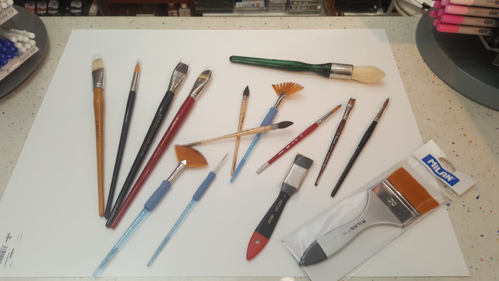 Según su forma trabajamos el plano, lengua de gato, redondo y de abanico, todos ellos disponibles en mango largo y margo corto, según la técnica a realizar.